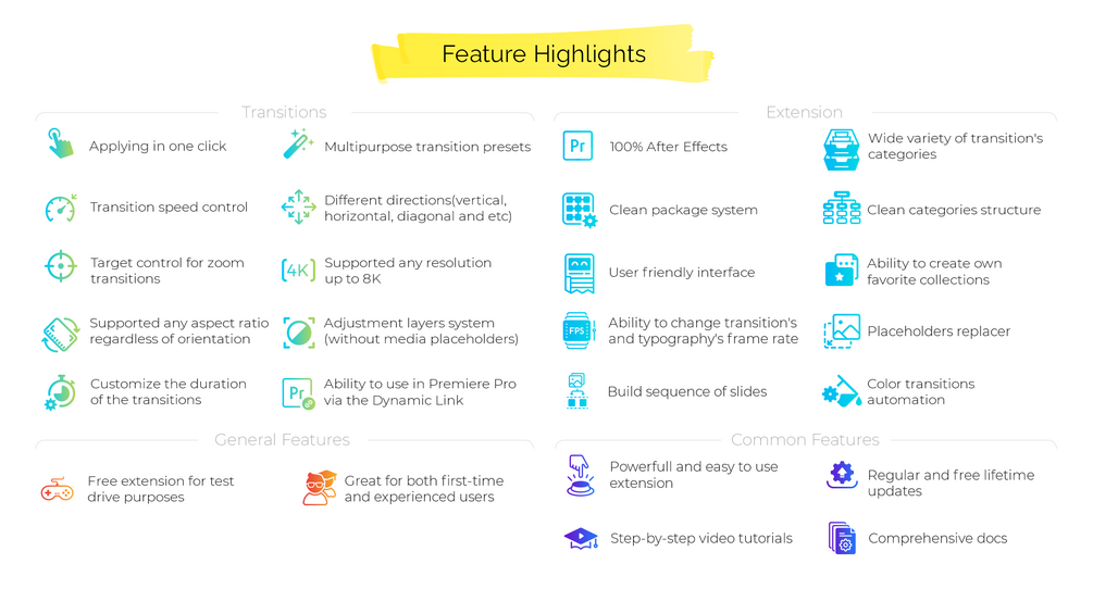 There are already a huge number of different packs on the world market and among them you need to find the right one. This is where we solve one important problem - you no longer need to search among the many packs. We made a unique powerful extension and more than 5500 transitions of various types are included. The best all-in-one transitions pack!